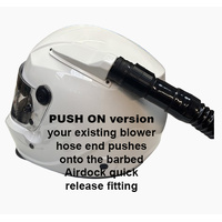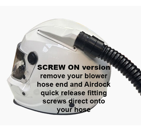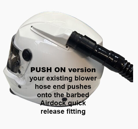 Your existing helmet air pump hoses can be used without modification using our 'push-on' barbed-end AirDock attachment. Alternatively, if you prefer to remove your hose end piece, we offer a version of AirDock designed to 'screw on' directly onto standard 1.25" blower hoses for a more compact installation.